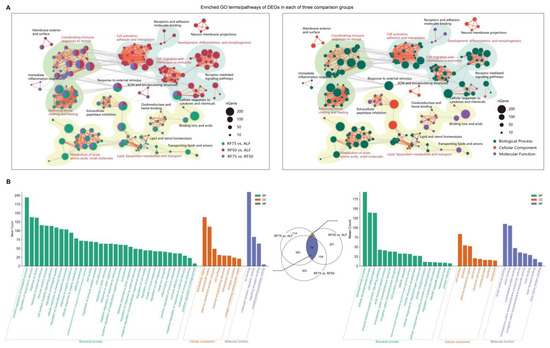 Functional enrichment analysis of DEGs in compensatory growth. (A) Network plots constructed from the top 100 GO terms identified in each of the three comparison groups. Each node represents a pathway, with the pie size indicating the gene number associated with the GO term, the thickness of the edges representing the number of shared genes, and the colors denoting different comparison groups (left) or ontology categories (right). (B) Bar charts illustrating the number of GO pathways shared across all three comparison groups (left) and shared between the RF75 vs. ALF and RF50 vs. ALF comparison groups (right).