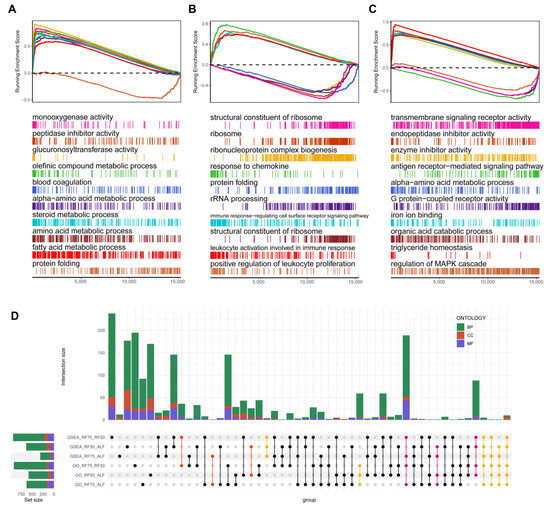 The top 10 representative pathways from GSEA results comparing (A) RF75 vs. ALF, (B) RF50 vs. ALF, and (C) RF75 vs. RF50 groups. Each broken line represents a pathway with its enrichment score plotted along the x-axis, and each vertical line represents a gene contributing to the enrichment score of the pathway. (D) UpSet plot combining results from GSEA and differential expression GO enrichment analyses, showing the intersections of significantly enriched pathways and gene ontologies across the different comparative groups. The size of each set is indicated by bar height, while the intersections are represented by connected dots, color-coded by ontology category (BP: biological process, CC: cellular component, MF: molecular function).