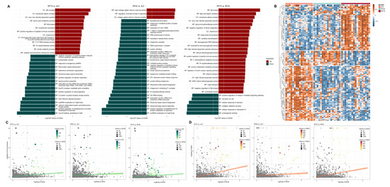 Gene set enrichment analysis (GSEA) was performed to further explore the biological significance of gene expression profiles among the three experimental groups. For the GSEA, all genes involved in the pairwise comparisons between the groups were considered. The method involved ranking all genes based on their differential expression levels obtained from the previous analysis. The ranked list of genes was then analyzed against the gene sets from the rebuilt GO database, allowing us to identify whether sets of genes associated with specific BP, CC, or MF were statistically overrepresented at the top or bottom of the ranked list [78]. The analysis was performed using clusterProfiler, where the enrichment score (ES) reflects the degree to which a gene set is overrepresented at the extremes of the entire ranked list of genes. Statistical significance was determined using phenotype-based permutation tests, with the normalized enrichment score (NES) > 1 and adjusted p-value < 0.05 considered significant.