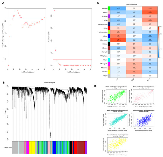 - Langfelder, P.; Horvath, S. WGCNA: An R package for weighted correlation network analysis. BMC Bioinform. 2008, 9, 559. [Google Scholar] [CrossRef] [PubMed]
