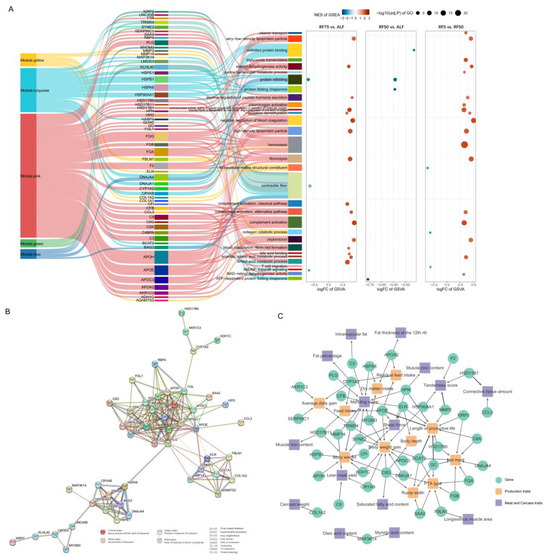 Integrated analysis to identify key genes related to compensatory growth. (A) Sankey–bubble plot of key genes and pathways. The Sankey plot demonstrates integrated flow between modules, genes, and pathways, where the size of each bubble corresponds to the Gene Ontology (GO) enrichment analysis’s −log10(adj.p), the x-axis represents the logFC from GSVA, and the bubble color indicates the normalized enrichment score (NES) from GSEA. (B) Network of protein–protein interaction (PPI) among key genes. (C) Relationships of key gene and production or meat and carcass traits quantitative trait loci (QTL). Cyan circles: key genes. Orange squares: QTL of production traits. Purple squares: QTL of meat and carcass traits.