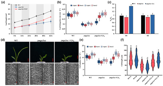 The leaf length of zmga3ox was lower than that of wild-type (WT), with the addition of exogenous GA3, the leaf length of zmga3ox + GA3 gradually increased and reached a length between that of the zmga3ox and the WT (Figure 1a). Similarly, the leaf elongation rate was higher in WT than zmga3ox, and the leaf elongation rate in light was higher than that in darkness (Figure 1b). The GA3 treatment could increase the leaf elongation rate in zmga3ox, while zmga3ox + GA3 had a higher leaf elongation rate in darkness than in light. Moreover, the VD/VL value of WT was higher than zmga3ox in the D1 and D2 processes, but zmga3ox + GA3 had a higher VD/VL value compared with WT in both processes (Figure 1c). In addition, the cell growth rate in WT and zmga3ox both presented lower in darkness than in light, while WT had a higher cell growth rate compared to zmga3ox, and GA3 treatment could increase the cell growth rate in zmga3ox (Figure 1d,e). Importantly, there was no significant difference in the cell length of WT between the reproduction in light and darkness, but the cell length of zmga3ox from the reproduction in darkness was shorter than that in light (Figure 1f). GA3 treatment significantly promoted cell elongation in zmga3ox, while zmga3ox + GA3 had longer cell length from the proliferation in darkness than that in light.