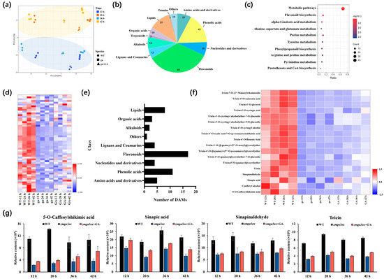 Metabolic profile and pathway analysis of GA-regulated metabolites. (a) Principal component analysis (PCA) of accumulation pattern showed two distinct groups: darkness (yellow) and light (blue) for samples taken at 4 time points in zmga3ox, zmga3ox + GA3 and WT. (b) The number and species of differentially accumulated metabolites (DAMs) in metabolome data. (c) KEGG enrichment analysis for all the DAMs regulated by GA3 in zmga3ox. The color of the point represents p, and the size of the point represents the number of DAMs. (d) Heat map of 55 DAMs upregulated by GA3 treatment. (e) The number and species of 55 DAMs upregulated by GA3 in metabolome data. The horizontal coordinate represents the number of DAMs, and the vertical coordinate represents the category. (f) Heat map of 18 DAMs related to lignin synthesis and regulated by GA3. (g) Relative content of metabolites involved in lignin synthesis and accumulated rhythmically, respectively, 5-O-Caffeoylshikimic acid, sinapic acid, sinapinaldehyde and tricin. Data were shown as the mean ± SD (n = 3).