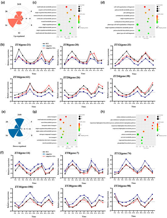 Analysis of circadian gene expression patterns and responsive pathway. (a) Statistics of the number of circadian genes with upregulated expression induced by GA3 at different time points. (b) The number and expression pattern of circadian genes upregulated by GA3 reached the peak expression, ZT4 expression peaked at 4 h after GA3 treatment, and ZT8 peaked at 8 h, ZT12, ZT16, ZT20, ZT24 and so on. (c) Pathway enrichment analysis of upregulated DEGs in light. The color of the point represents p, and the size of the point represents the number of DEGs. (d) Pathway enrichment analysis of upregulated DEGs in darkness. The color of the point represents p, and the size of the point represents the number of DEGs. (e) Statistics of the number of circadian genes with downregulated expression induced by GA3 at different time points. (f) The number and expression pattern of circadian genes downregulated by GA3 reached the peak expression, ZT4 expression peaked at 4 h after GA3 treatment, and ZT8 peaked at 8 h, ZT12, ZT16, ZT20, ZT24 and so on. (g) Pathway enrichment analysis of downregulated DEGs in light. The color of the point represents p, and the size of the point represents the number of DEGs in light. (h) Pathway enrichment analysis of downregulated DEGs in darkness. The color of the point represents p, and the size of the point represents the number of DEGs.