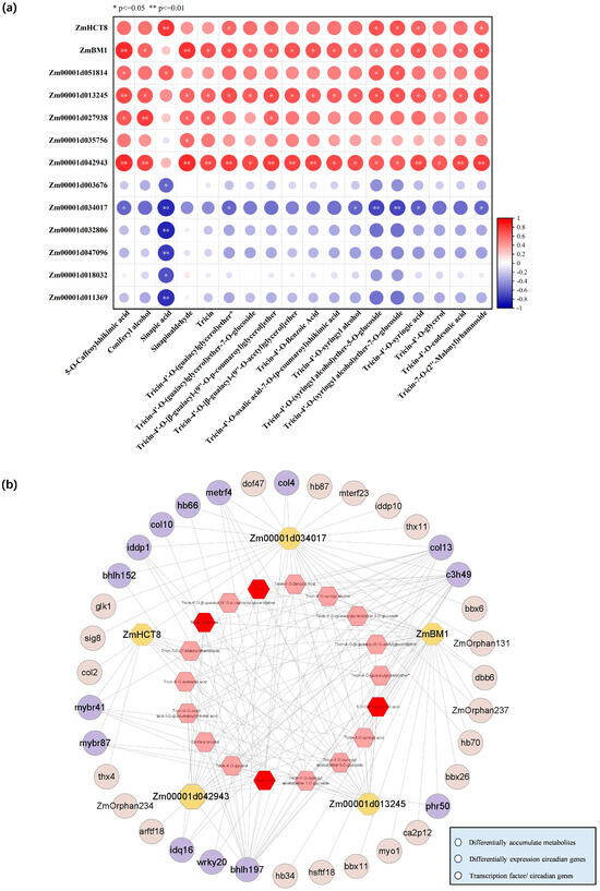 The correlation between the expression of circadian DEGs related to cell wall synthesis and lignin synthesis DAMs was analyzed, and 13 genes were identified (Figure 6a), among which lignin synthase genes ZmBM1 and ZmHCT8, Zm00001d042943 (UXS1), Zm00001d013245 (UGD2) and Zm00001d034017 (Exhydrolase II) were significantly correlated with DAMs. Then, the gene regulatory network analysis (GRN) was performed with this five circadian DEGs. As shown in Figure 6b and Figure S5a, a total of 81 transcription factors were identified (Table S4), and 35 rhythmical transcription factors including ZmARF18, ZmDOF47, ZmMYBr41/87, ZmHB34/70, and ZmbHLH197 were obtained. Between the 35 rhythmical transcription factors, 14 were correlated with DAMs in lignin synthesis (Figure 6b and Figure S4), including ZmMYBr41, ZmMYBr87, ZmbHLH197, ZmWRKY20, ZmC3H49, and ZmHB66. Among the 18 DAMs associated with lignin synthesis, they were all associated with different cell wall synthesis or expansion genes, among which sinapinaldehyde, sinapic acid, 5-O-caffeoylshikimic acid, and two tricin derivatives had a significant correlation with cell-wall-related DAMs (Figure 6b), Most importantly, sinapinaldehyde, sinapic acid, 5-O-caffeoylshikimic acid and tricin were DAMs that were accumulated rhythmically.