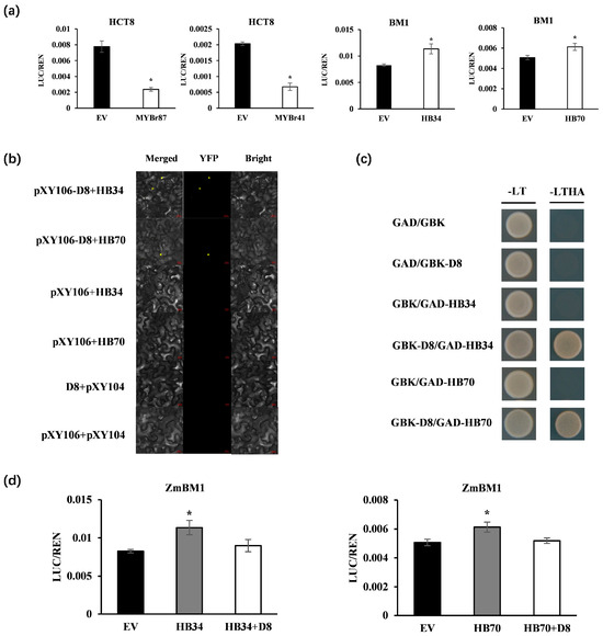 To analyze the regulatory network of lignin synthesis regulated by GAs and verify the reliability of the transcriptional regulatory network, the binding sites of transcription factors and target genes were analyzed (Figure S5), and a dual-luciferase assay was performed on the interaction of transcription factors and target genes (Figure 7a). The expression of ZmHCT8 was repressed by ZmMYBr41 and ZmMYBr87. ZmHB34 and ZmHB70 promoted the transcription expression of ZmBM1.