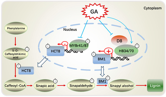The ZmHB34, ZmHB70 and ZmBM1 had the same expression pattern, while were upregulated by GA3 in zmga3ox. Meanwhile, the ZmHB34 and ZmHB70 promoted the expression of ZmBM1, which suggested that ZmHB34 and ZmHB70 were the positive regulators of the lignin synthesis. Many studies showed that GAs may regulate the expression of cell-wall-related genes through DELLA interaction with transcription factors [86,87,88,89,90]. Here, ZmD8 might interact with ZmHB34 and ZmHB70 to inhibit the expression of ZmBM1, affecting the conversion of sinapinaldehyde to sinapyl alcohol in lignin synthesis (Figure 8). Consequently, the proposed working model was built that GAs could regulate the expression of the rhythmic transcription factors ZmMYBr41/87 and ZmHB34/70 to modulate the lignin biosynthetic genes ZmHCT8 and ZmBM1 for manipulating the leaf elongation growth (Figure 8). In addition, GAs-mediated leaf rhythmic growth was involved in regulating the cell number and length, and it would be further study to explore how GAs modulated cell proliferation for responding to the leaf rhythmic growth.