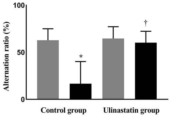 The alternation ratios of the two groups, using the Y-maze test, were similar before general anesthesia (63 ± 12% in the control group vs. 64 ± 12% in the ulinastatin group, p = 0.81); however, a significant difference was observed after general anesthesia (17 ± 24% in the control group vs. 60 ± 12% in the ulinastatin group, p = 0.006). General anesthesia significantly reduced the alternation ratio in the control group (p = 0.005). However, the alternation ratios before and after general anesthesia in the ulinastatin group were similar (p = 0.58) (Figure 1).
