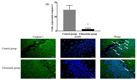 The neuronal damage, expressed by caspase-1, was significantly different between the groups. The ulinastatin group showed a significantly lower expression of caspase-1 (12.91 ± 3.89% in the control group vs. 2.73 ± 0.28% in the ulinastatin group, p < 0.001) (Figure 2A). The ulinastatin group also showed a significant lower number of cells expressing caspase-1 (52.00 ± 10.86 in the control group vs. 4.60 ± 2.70 in the ulinastatin group, p < 0.001) (Figure 2B).