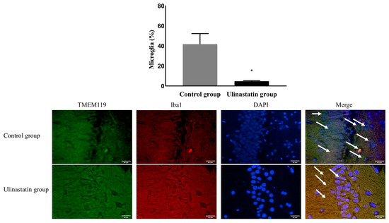 Immunofluorescence staining to detect the activated microglia (represented with white arrows). Abbreviations: TMEM 119, transmembrane protein 119; Iba1, ionized calcium-binding adapter molecule 1; DAPI, 4′,6-diamidino-2-phenylindole. *: p < 0.001, compared with the control group.