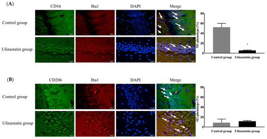 Differentiation of the phenotypic expression of microglia, M1 phenotype (represented with white arrows) as a pro-inflammatory producer (A) and M2 phenotype (represented with white arrows) as an anti-inflammatory producer (B). Abbreviations: CD, cluster of differentiation; Iba1, ionized calcium-binding adapter molecule; DAPI, 4′,6-diamidino-2-phenylindole. *: p < 0.001, compared with the control group.