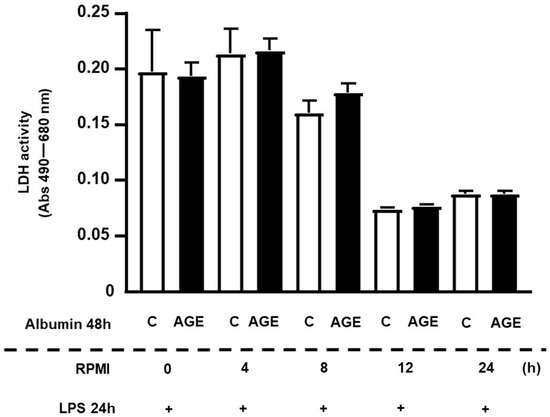 The release of lactate dehydrogenase (LDH) was similar between cells treated with C- or AGE-albumin. Although decreases in LDH activity were observed at 12 h and 24 h, the values remained similar between the two experimental conditions (Figure 1).