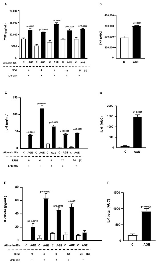 Figure 2 illustrates the role of AGE-albumin in immediate cell sensitization (time, 0 h) to LPS, showing increased secretions of TNF (Figure 2A), IL-6 (Figure 2C), and IL-1beta (Figure 2E). Additionally, a persistent effect was observed, sustained for up to 24 h of TNF and IL-6 secretions and 12 h for IL-1beta. There were 1.56-fold, 16-fold, and 5.2-fold increases in the area under the curve (AUC), respectively, for the secretions of TNF, IL-6, and IL-1beta in cells incubated with AGE-albumin, compared to C-albumin (Figure 2B,D,F).