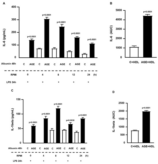 Persistence of the effect of AGE-albumin on the inflammatory response in RAW 264.7 macrophages. RAW 264.7 macrophages were treated for 24 h with acetylated LDL (50 µg/mL) and then with C- or AGE-albumin (2 mg/mL), alone or in the presence of HDL (50 µg/mL), for 48 h. Following various resting intervals in RPMI/FAFA, cells were exposed to LPS (1 µg/mL) for 24 h. The concentrations of TNF, IL-6, and IL-1beta were determined by ELISA, with total concentrations presented in panels (A,C) and the area under the curve (AUC) depicted in panels (B,D). Normality was tested using the Shapiro–Wilk test, and comparisons were conducted using Student’s t-test. Results are expressed as mean ± standard error of the mean (n = 6 for each incubation time).