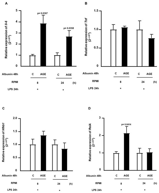 The expression of genes related to inflammation was determined at 8 h and 24 h after the removal of C- or AGE-albumin, followed by incubation with LPS. In Figure 4A, it is observed that the expression of Il6 remained elevated at both 8 h and 24 h after the removal of AGE-albumin, following the challenge with LPS. However, the expression of Tnf was not altered (Figure 4B). The expression of Nfkb1 showed no difference at 8 h and 24 h (Figure 4C); on the other hand, RelA showed increased expression at 8 h and normalization at 24 h (Figure 4D).