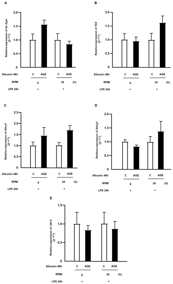 Temporal profile of gene expression related to cholesterol efflux in macrophages treated with C- or AGE-albumin and challenged with LPS. RAW 264.7 macrophages were treated for 48 h with C- or AGE-albumin (2 mg/mL) and, after washing, maintained over time only in a culture medium containing fatty acid-free albumin. Subsequently, they were challenged with LPS for 24 h. Gene expressions of Ager (A), Tlr4 (B), Abca1 (C), Abcg1 (D), and Jak2 (E) were assessed by RT-qPCR. Comparisons were made using the Student’s t-test, with data normalization to the control condition for each time point; values are presented as mean ± standard error of the mean (n = 5).