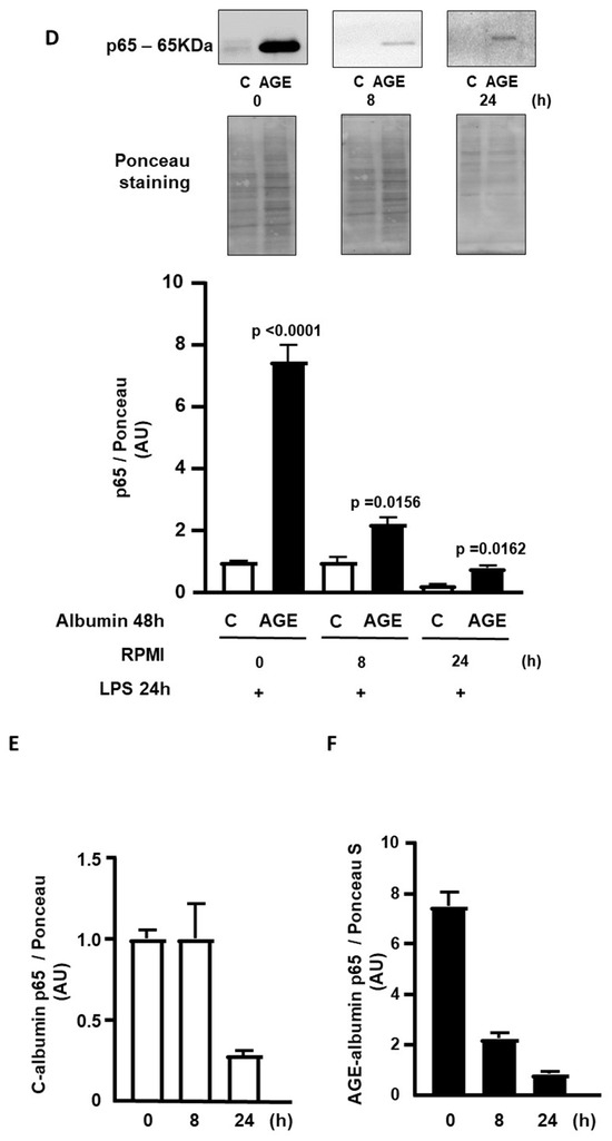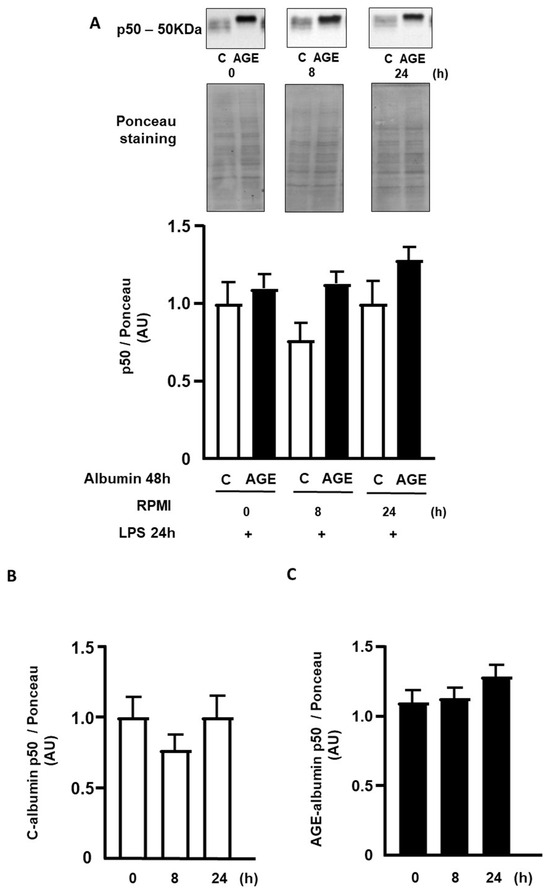 The nuclear contents of p50 and p65 subunits of NFKB were determined by Western blot at 0 h, 8 h, and 24 h after the removal of C- or AGE-albumin, followed by incubation with LPS. The nuclear content of p50 was similar when comparing cells treated with C- or AGE-albumin during the mentioned periods (Figure 6A) and also between the time points considering the same treatment (Figure 6B,C). The nuclear content of p65 was 2.9 times higher in cells treated with AGE-albumin, compared to those exposed to C-albumin, remaining elevated up to 24 h (Figure 6D). Regarding the time points, considering the same treatment, cells treated with C-albumin showed a decrease in p65 protein only from 24 h onwards (Figure 6E). Cells treated with AGE-albumin demonstrated a decreasing profile over time, with lower concentration at 24 h (Figure 6F).