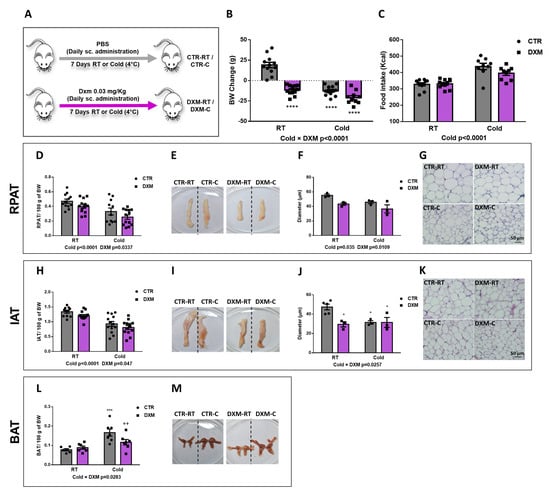 In vivo effects of DXM treatment. (A) Experimental design for in vivo DXM effects in male rats housed at RT (22 °C) or cold (4 °C). (B) Body weight change and (C) mean of caloric intake during DXM treatment. Percentage masses of (D) RPAT and (H) IAT. Representative images from (E) RPAT and (I) IAT depots. Adipocyte size (diameter) from (F) RPAT and (J) IAT adipocytes. Representative images from haematoxylin-eosin stained sections from (G) RPAT and (K) IAT. Magnification ×400. Scale bar: 50 µm. n = 3–4 samples per group. (L) Percentage mass and (M) representative images from BAT, respectively. In all cases, two-way ANOVA was performed for factors (Cold or DXM) and interaction analysis (Cold × DXM) followed by Tukey’s post-test. Results for factors and interaction are shown in each graph. * p < 0.05, *** p < 0.001 and **** p < 0.0001 vs. CTR-RT. ++ p < 0.01 vs. CTR-C. n = 10–12 rats per group. Data shown are mean ± SEM.