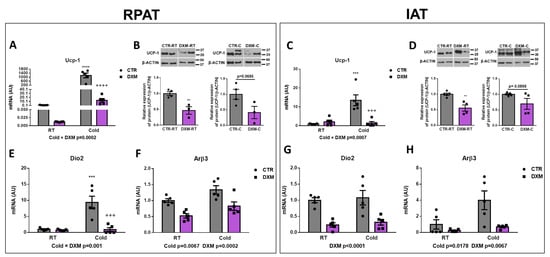 To evaluate the effect of DXM on WAT browning, we analysed different thermogenic markers in RPAT and IAT from basal or cold-stimulated rats treated or not treated with DXM. First, we evaluated the mRNA expression of Ucp-1 as the main functional marker of thermogenesis. We found that DXM generated a differential response to Cold, decreasing, to a large extent, the mRNA expression of Ucp-1 in DXM-C mice in both WAT depots (Figure 2A,C). The comparison among groups showed a significant rise of Ucp-1 expression in CTR-C rats compared to CTR-RT and a decrease in DXM-C compared to CTR-C rats. Furthermore, we observed that the response to cold stimulation was several thousand-fold higher in RPAT than in IAT from CTR-C rats, suggesting that RPAT is thermogenically more active than IAT. UCP-1 protein levels were also evaluated, and showed that UCP-1 levels decreased in RPAT and IAT depots from DXM treated rats in basal conditions (DXM-RT vs. CTR-RT) and showed a strong tendency to low values in stimulated conditions (DXM-C vs. CTR-C, Figure 2B,D). Additionally, the expression of converting T4 to T3 enzyme Dio2 was quantified. We found that in RPAT, DXM exerted a more marked decreased in mRNA expression in Cold conditions (Cold × DXM interaction), while in IAT caused a proportional inhibition, regardless of housing temperature (Figure 2E,G). Group to group comparison in RPAT showed an increase in Dio2 mRNA levels in CTR-C vs. CTR-RT rats and a decrease in DXM-C vs. CTR-C rats. Finally, we found that DXM decreased Arβ3 gene expression at both RT and Cold conditions, while Cold increased it regardless of basal or DXM treatment in both AT depots (Figure 2F,H). Overall, these results indicate that DXM may be exerting an inhibitory effect in RPAT and IAT browning.