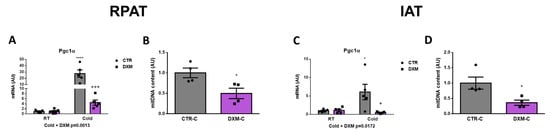 We wanted to know if DXM affected the mitochondrial content in RPAT and IAT. For this purpose, we evaluated the gene expression of the mitochondrial biogenesis marker Pgc1α in both tissues. We found a reduction in Pgc1α expression in DXM-C rats from both AT depots (Figure 3A,C). The comparison of Pgc1α expression among groups in RPAT and IAT showed similar results: an increase in CTR-C rats and a marked fall in DXM-C rats vs. CTR-C. To further characterize the DXM effect on mitochondria number, we measured mitochondrial DNA content in cold-stimulated conditions, where deeper DXM effects were observed. We found a significant drop in mitochondrial DNA content in both depots (Figure 3B,D). These results suggest that DXM could affect the mitochondrial content, which could contribute to DXM browning inhibition.
