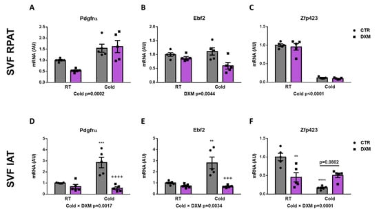 Gene expression of beige precursor markers in SFV cells treated with DXM. mRNA levels of Pdgfrα, Ebf2 and Zpf423 in SVF cells from (A–C) RPAT and (D–F) IAT. Two-way ANOVA was performed for factors (Cold or DXM) and interaction analysis (Cold × DXM) followed by Tukey’s post-test. Results for factors and interaction are shown in each graph. ** p < 0.01, *** p < 0.001 and **** p < 0.0001 vs. CTR-RT. +++ p < 0.001 and ++++ p < 0.0001 vs. CTR-C. n = 5 samples per group were analysed in duplicate. Data shown are mean ± SEM.
