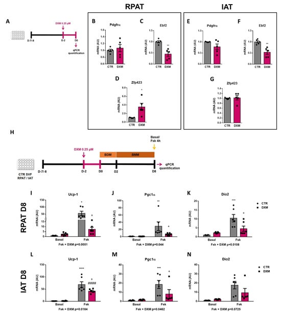 Fresh RPAT and IAT pads were dissected, weighed and digested with collagenase Type I, as previously reported [55]. Briefly, fat tissues were minced and digested using 1 mg/mL collagenase solution in DMEM (at 37 °C, for 1 h). After centrifugation (1000 rpm, during 15 min), floating mature adipocytes were discarded. SVF pellets were filtered (in a 50 μm mesh nylon cloth) and washed with DMEM (×3). SVF cells were then resuspended in DMEM supplemented with 10% (v/v) fetal bovine serum (FBS), HEPES (20 nM), 100 IU/mL penicillin and 100 μg/mL streptomycin (basal medium) and reserved for further measurement. SVF cells from CTR rats were seeded (2 × 104 cells/cm2) in 24-well plates and cultured up to confluence (5 days) in DMEM supplemented with 10% (v/v) FBS and antibiotics at 37 °C in a 5% CO2 atmosphere [55]. Then, cells were used for two experimental designs. First, to evaluate the effects of DXM on APCs and posterior beige adipocyte differentiation, cells were incubated in presence or absence of DXM 0.25 μM (DXM and CTR, respectively) for 48 h. Then, DXM was removed and cells were harvested immediately (D0) (Figure 5A) or were induced to differentiate by the addition of beige differentiation mix (BDM) containing 5 µg/mL insulin, 2.5 μM DXM, 0.5 mM 3-isobutyl-L-methylxanthine (IBMX), 1 μM rosiglitazone and 0.1 nM triiodothyronine (T3) for 48 h. Afterwards, BDM was removed and replaced with fresh medium containing 5 µg/mL insulin and T3 (Beige Maintenance Medium, BMM). On day 8 after differentiation (D8), a subset of CTR and DXM cells were incubated in basal condition or with Fsk (10 µM) for 4 h (CTR-Fsk and DXM-Fsk, respectively) (Figure 5H). Cells were then processed for qPCR quantification of several thermogenic markers. Additionally, and following a similar protocol, to evaluate DXM effect on transdifferentiation or thermogenesis of mature beige adipocytes, cells were incubated or not with 0.25 µM DXM the last 48 h of culture (Figure 6A).