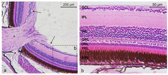 (a) N. guentheri retina (arrows), optic nerve (asterisk). (b) Stratigraphy of N. guentheri retina: RPE, PRL, ONL, OPL, INL, IPL, GCL. Hematoxylin-Eosin. Magnification (a) 20× (b) 40×.