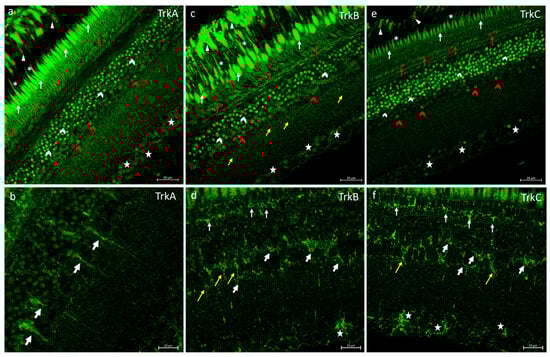 In the retina of N. guentheri, the neurotrophins receptors TrkA, TrkB, and TrkC were always localized in the extensions of RPE and in the inner and outer segments of the PRL (Figure 2a–d,f). In the OPL TrkA, TrkB, and TrkC were found (Figure 2a–c). In the INL, several subpopulations of ACs and some BCs were immunopositive to Trks (tyrosine protein kinase receptors) (Figure 2). Also, the neurotrophin receptor TrkB and TrkC were localized in HCs (Figure 2d,f). Different subpopulations of GCs immunostained to Trk receptors (Figure 2) were also observed.