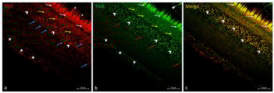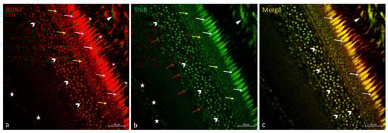 In the retina of N. guentheri, the BDNF/TrkB system was immunolocalized in RPE prolongations, and in the inner segment of the PRL (Figure 3). In the PRL, the outer segment was exclusively BDNF immunostained (Figure 3a), and the inner segment of the photoreceptors is BDNF and TrkB was double-marked (Figure 3c). BDNF and TrkB were observed in the OPL, but they did not overlap (Figure 3). Distinct subpopulations of ACs exhibited immunoreactivity to BDNF and TrkB separately (Figure 3a,b), just some of them showed double staining (Figure 3c). In the GCL, the soma of the GCs (ganglion cells) was BDNF and TrkB immunostained (Figure 3a,b).