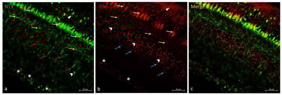 Regarding the NT-3/TrkC system in the N. guentheri retina, RPE cell prolongation immunostain was found. In the PRL, the inner segment immunopositive to NT-3 and the outer segment immunoreactive to TrkC have been observed. The OPL was NT-3 and TrkC immunoreactive (Figure 5). In the INL, BCs immunoreactive with NT-3 (Figure 5a) and a subpopulation of ACs immunopositive to TrkC (Figure 5b) were seen. In GCL, several subpopulations of GCs were NT-3 and TrkC immunostained, respectively (Figure 5a,b). Colocalization views were never observed (Figure 5c).