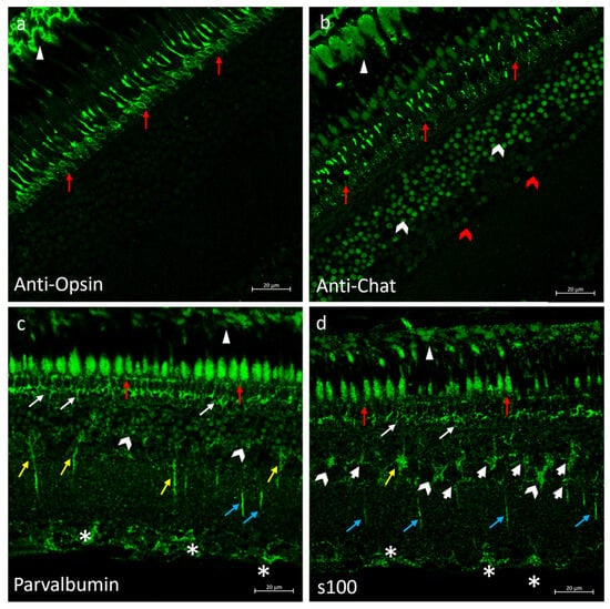 To ascertain the cellular identity of the immunopositive cells shown, anti-Opsin (specific for rods), anti-Chat (specific for ACs), parvalbumin (specific for BCs), and s100p (specific for HCs and GCs) antibody immunoreactions were investigated. The observed immunostaining perfectly overlapped the specificity of the antibodies used as markers (Figure 6). In addition, the RPE was immunoreactive to anti-chat, anti-opsin, s100, and parvalbumin; the outer segment of the PRL was anti-chat, parvalbumin, and s100 immunostained, and the inner segment of the PRL was parvalbumin and s100 immunoreactive. In the INL, ACs were parvalbumin and s100 immunolabeled; finally, GCs were also parvalbumin immunopositive (Figure 6).