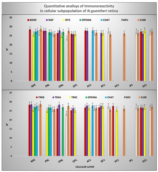Graphical representation of immunoreactivity quantitative analysis in: RPE, PRL (inner and outer segments), OPL, ACs, BCs, HCs, IPL, and GCs detected by BDNF, NGF, NT-3, TrkA, TrkB, TrkC, anti-Opsin, anti-Chat, Parvalbumin and, s100p. The statistical analysis shows a different distribution pattern of the antibodies used in this study in cellular layer of N. guentheri retina. N°: mean of retinal layer cells immunopositive to BDNF, NGF, NT-3, TrkA, TrkB, TrkC, anti-Opsin, anti-Chat, Parvalbumin and, s100p.