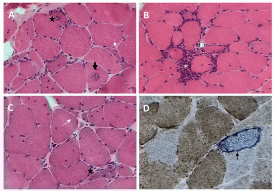 - Vattemi, G.; Mirabella, M.; Guglielmi, V.; Lucchini, M.; Tomelleri, G.; Ghirardello, A.; Doria, A. Muscle biopsy features of idiopathic inflammatory myopathies and differential diagnosis. Autoimmun. Highlights 2014, 5, 77–85. [Google Scholar] [CrossRef] [PubMed]