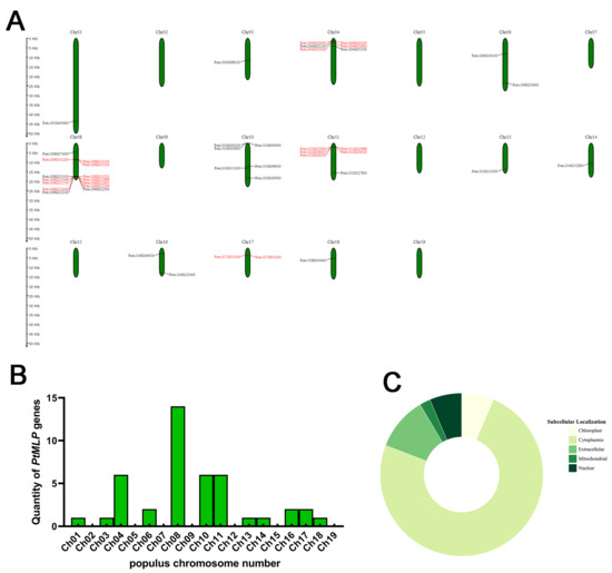 Genomic distributions and prediction of subcellular localization of PtMLPs. (A) PtMLP gene distribution across 19 chromosomes of Populus trichocarpa. Vertical bars represent chromosomes and the scale on the left represents the chromosome length (Mb). Tandemly duplicated genes are indicated in red. (B) Numbers of PtMLP genes on each chromosome. (C) Subcellular localization prediction of PtMLPs.