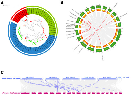 Phylogenetic analysis of PtMLPs. (A) Phylogenetic relationships of MLPs between Populus trichocarpa and Arabidopsis thaliana. The three subclasses are marked with different colors. Red represents Class I, blue represents Class II, and green represents Class III. PtMLPs are marked with red stars and AtMLPs are marked with green circles. (B) The segmental replication events of PtMLP genes in Populus trichocarpa. Gray lines indicate all synteny blocks in the Populus trichocarpa genome and red lines indicate segmental duplication of PtMLP genes. (C) Collinearity analysis of MLP genes between Populus trichocarpa and Arabidopsis thaliana. Blue lines indicate the homologous MLP gene pairs.