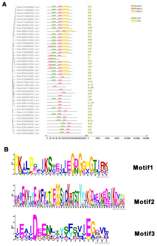 Gene structure and conserved motifs of PtMLP family. (A) The gene structure and conserved motifs of PtMLPs. Left: Conserved motifs are displayed in different colors and correspond one-to-one in the structural diagram. Right: yellow boxes represent exons, green boxes represent untranslated regions, and black lines indicate introns. (B) The logo and indicated domain of each motif.