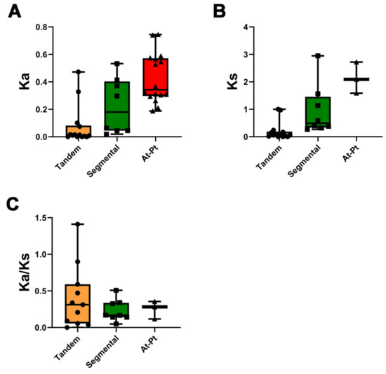 Ka/Ks analysis of the PtMLP gene family. (A) Average Ka values of tandem duplication and segmental duplication of PtMLPs and the duplication between Populus trichocarpa and Arabidopsis thaliana. (B) Average Ks values of tandem duplication and segmental duplication of PtMLPs and the duplication between Populus trichocarpa and Arabidopsis thaliana. (C) Average Ka/Ks values of tandem duplication and segmental duplication of PtMLPs and the duplication between Populus trichocarpa and Arabidopsis thaliana. The black dots, triangles and squares represent the data values of tandem, segmental and At-Pt duplication, respectively.
