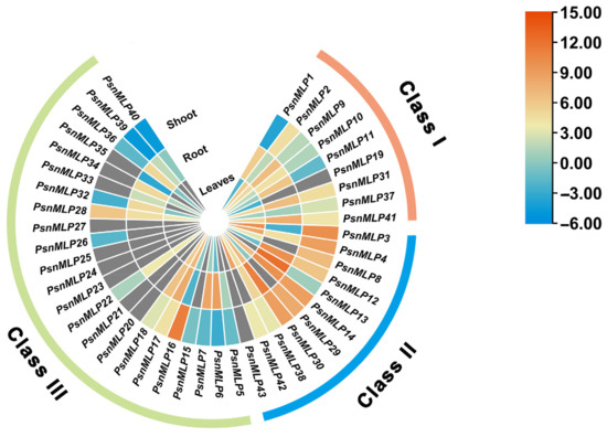 We performed RNA-Seq analysis using Populus simonii × P. nigra as the plant material and the Populus trichocarpa genome as the reference genome. Based on the 43 PtMLP genes identified from the results above, the MLP genes of Populus simonii × P. nigra were named PsnMLP1–PsnMLP43. In comparison to the leaves and stems, the majority of the PsnMLP genes were significantly expressed in the roots. PsnMLP13 had the greatest expression level, while seven genes (PsnMLP20, PsnMLP21, PsnMLP23, PsnMLP24, PsnMLP25, PsnMLP27, PsnMLP43) were expressed at extremely low levels in all tissues (Figure 6). Members of Class I were expressed in the roots, stems, and leaves, with higher expression in the roots than in the stems and leaves. Most of the Class II members were expressed in all three tissues and at a higher level. Many of the Class III members had very low expression, being nearly undetectable, and the majority of them were expressed in the roots. It is notable that PsnMLP19 was specifically expressed in the leaves, while PsnMLP15 and PsnMLP26 were expressed only in the stems and PsnMLP35 was expressed in the roots only, suggesting that these genes are involved in the regulation of leaf, stem, and root growth and development, respectively.