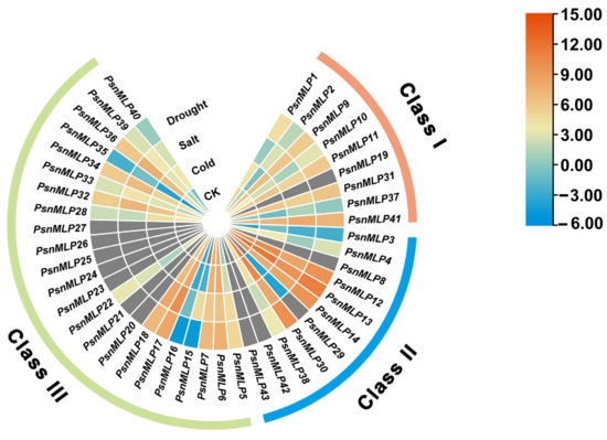 With the exception of PsnMLP9 and PsnMLP11, which displayed slight upregulation under cold stress, all of the genes in Class I had downregulated expression. With the exception of PsnMLP2 and PsnMLP37, all genes were downregulated in response to salt stress. In response to drought stress, the expression of five genes was downregulated and that of four genes was upregulated. Under each of the three stresses, the expression levels of PsnMLP1, PsnMLP10, and PsnMLP31 were downregulated. Members of the Class I family showed lower expression overall following their exposure to the three stressors (Figure 7).