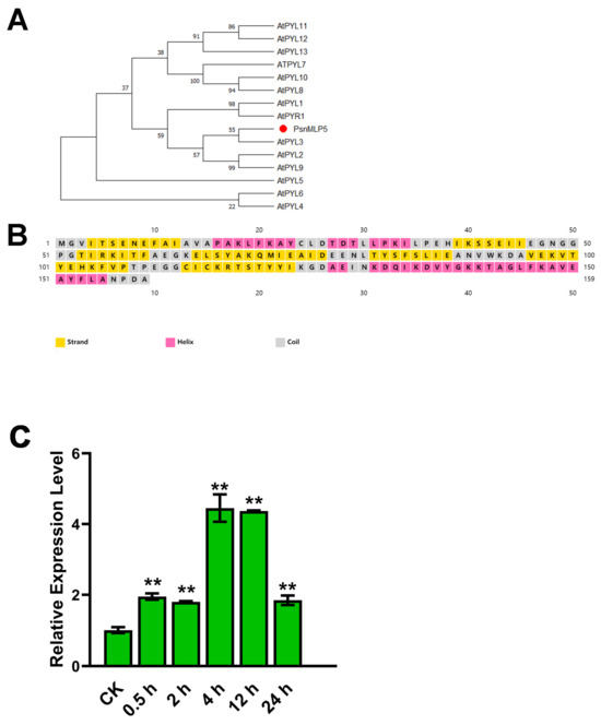 Response to ABA of PsnMLP5. (A) Evolutionary analysis between PsnMLP5 and AtPYR/PYL receptors. (B) Secondary structure of PsnMLP5. (C) Expression level of PsnMLP5 under ABA treatment. ** represents p < 0.01.