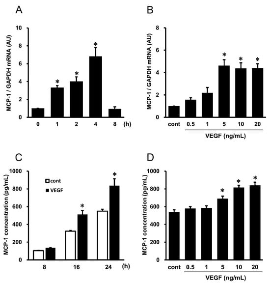 Vascular endothelial growth factor (VEGF)-stimulated gene expression and protein secretion of monocyte chemoattractant protein (MCP)-1 in human umbilical vein endothelial cells (HUVECs). (A) Time course of MCP-1 mRNA expression after treatment with 10 ng/mL of VEGF (n = 3), as evaluated by real-time reverse transcription polymerase chain reaction (RT-PCR). (B) MCP-1 mRNA expression in HUVECs after treatment with the indicated concentrations of VEGF for 4 h (n = 3), as evaluated by real-time RT-PCR. Bars represent MCP-1 mRNA after normalization to glyceraldehyde-3-phosphate dehydrogenase (GAPDH) mRNA and relative to 0 h in (A) and untreated control (cont) in (B). (C) Time course of MCP-1 concentrations in the culture supernatant after treatment with 10 ng/mL of VEGF (closed bars, n = 6), as analyzed by ELISA. The control, secretion of MCP-1 without VEGF treatment, is shown in open bars (n = 6), as analyzed by ELISA. (D) MCP-1 concentrations in the culture supernatant after treatment with the indicated concentrations of VEGF for 24 h (n = 6), as analyzed by ELISA. * p < 0.05 vs. 0 h in (A), vs. untreated control (cont) in (B,D), and vs. each control at the same time in (C).