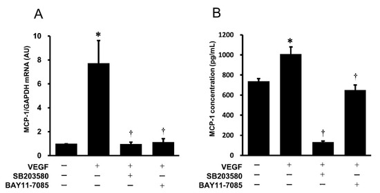 Effects of pharmacological inhibitors of the p38 MAPK and NF-κB pathways on VEGF-induced gene expression (A) and protein secretion (B) of MCP-1 in HUVECs. HUVECs were preincubated with SB203580 (10 μmol/L) and BAY11-7085 (10 μmol/L) for 2 h, followed by stimulation with VEGF (10 ng/mL) for 4 h to examine MCP-1 mRNA (A) or for 24 h to measure MCP-1 protein concentration (B). MCP-1 mRNA was evaluated by real-time RT-PCR ((A), n = 3), and MCP-1 concentration was examined by ELISA ((B), n = 6). * p <0.05 vs. untreated control. † p <0.05 vs. VEGF.