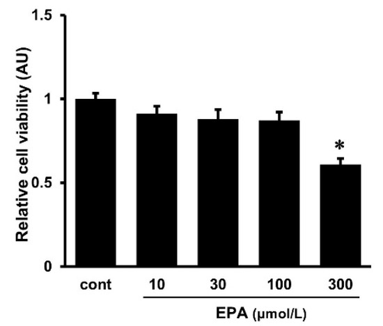 HUVEC viability when subjected to different concentrations (10, 30, 100, 300 μmol/L) of eicosapentaenoic acid (EPA) for 24 h. Cell viability was measured using the MTT assay. The results are expressed as a percentage of the untreated control (cont), and each value represents eight independent experiments (n = 8). * p < 0.05 vs. untreated control (cont).