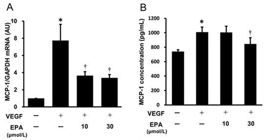 Effects of EPA on the gene expression and protein secretion of MCP-1 in HUVECs. VEGF-induced MCP-1 mRNA (A) and MCP-1 protein concentration (B) were suppressed by EPA. HUVECs were treated with VEGF (10 ng/mL) for 4 h (A) or 24 h (B) with or without pretreatment with EPA (10 and 30 μmol/L). Bars represent MCP-1 mRNA after normalization to GAPDH mRNA and relative to the untreated control in (A). Bars represent MCP-1 protein concentrations in (B). * p < 0.05 vs. untreated control. † p < 0.05 vs. VEGF.