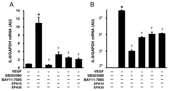 Effects of SB203580, BAY11-7085, and EPA on the VEGF-stimulated gene expression of IL-6 mRNA (A) and IL-8 mRNA (B) in HUVECs. HUVECs were preincubated with SB203580 (10 μmol/L) or BAY11-7085 (10 μmol/L) for 2 h each and EPA (10 and 30 μmol/L) overnight, then stimulated using VEGF (10 ng/mL) for 4 h to examine gene expression of IL-6 and IL-8. Bars represent IL-6 mRNA (A) and IL-8 mRNA (B) after normalization to GAPDH mRNA and relative to the untreated control. * p < 0.05 vs. untreated control. † p < 0.05 vs. VEGF.