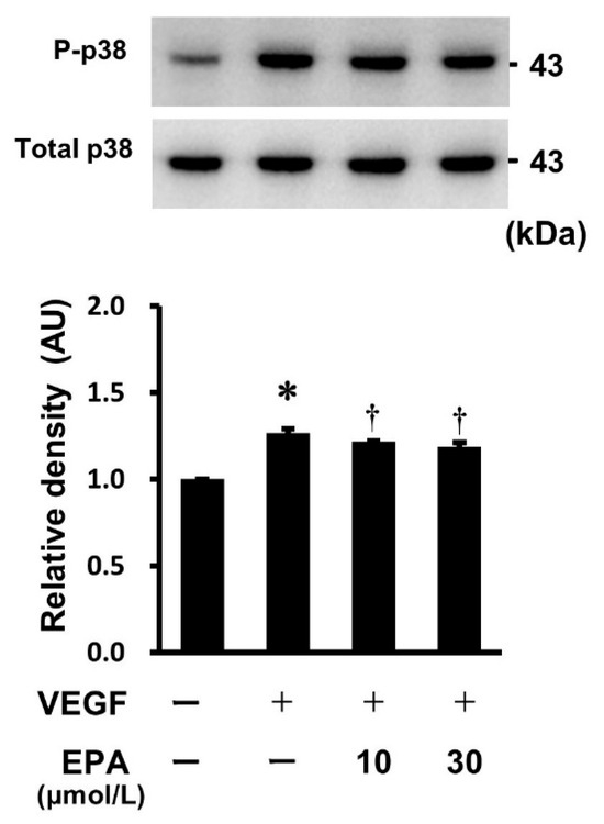 Effects of EPA on the VEGF-induced phosphorylation of p38 MAPK. EPA suppressed the phosphorylation of p38 MAPK in HUVECs. HUVECs were pretreated with EPA (10 and 30 μmol/L) overnight, then incubated with VEGF (10 ng/mL) for 5 min. Bars represent the results from the densitometric analyses of each phosphorylation signal after normalization to total protein and relative to the untreated control. Blots are representative of three independent experiments. * p < 0.05 vs. untreated control. † p < 0.05 vs. VEGF.