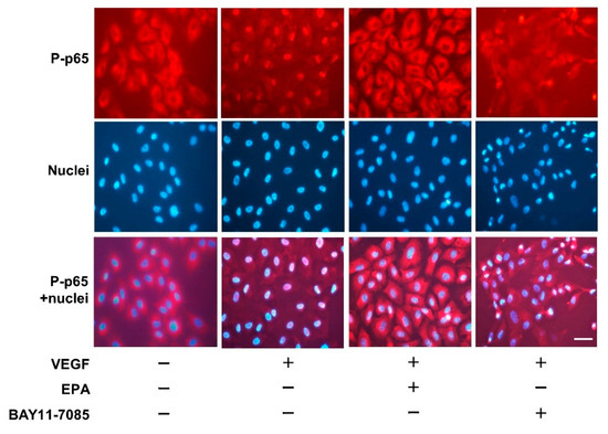 Effects of EPA and BAY11-7085 on VEGF-induced translocation of phospho-p65 to the nucleus, as determined by immunofluorescence staining. HUVECs were pretreated with EPA (30 μmol/L) or BAY11-7085 (10 μmol/L), followed by an additional incubation with VEGF (10 ng/mL) for 60 min. Representative immunofluorescence image showing the localization of phospho-p65 in HUVECs. Red staining indicates the specific Alexa staining for phospho-p65, and blue staining indicates the nuclei (Hoechst 33342). Original magnification, ×400. Scale bar = 50 μm.