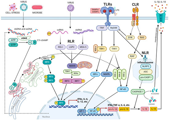 Inflammation is a highly intricate process that is regulated by the immune system in response to external or internal stimuli that threaten tissue integrity [7]. The innate immune system is primarily responsible for triggering this response. It recognizes molecules or portions of molecules that are released upon cellular stress or tissue injury, such as damage-associated molecular patterns (DAMPs), or are specific to pathogens, such as pathogen-associated molecular patterns (PAMPs). PAMPs and DAMPs bind to pattern recognition receptors (PRRs) located on the cytoplasmic or endosome membrane, activating intracellular signaling cascades that result in the expression of proinflammatory factors [8]. PRRs include toll-like receptors (TLRs), retinoic acid-inducible gene 1-(RIG1)-like receptors (RLRs), cytosolic DNA sensor cyclic GMP–AMP synthase (cGAS) stimulator of interferon genes (STINGs), C-type lectin receptors (CLRs), and nucleotide-binding oligomerization domain (NOD)-like receptors (NLRs) (Figure 1).