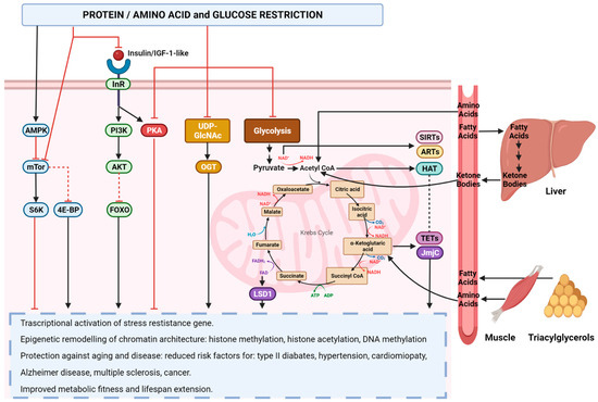 Epigenetic mechanisms are influenced by nutrition, which regulates metabolic pathways and produces intermediate metabolites that serve as coactivators for the enzymes involved in the modification of chromatin and DNA. A diet low in carbohydrates and proteins, including CR and PF, causes a metabolic shift from glycolysis to ketone bodies and fatty acid-based oxidative phosphorylation (OXPHOS). This metabolic change results in alterations in the metabolites produced by glycolysis and the Krebs cycle, such as NAD+, flavin adenine dinucleotide (FAD+), lactate, and α-ketoglutarate, which impacts gene expression by regulating epigenetic writers involved in the DNA methylation and histone acetylation, ADP ribosylation, methylation, O-GlcNAcylation, and lactylation [191,196,198,210].