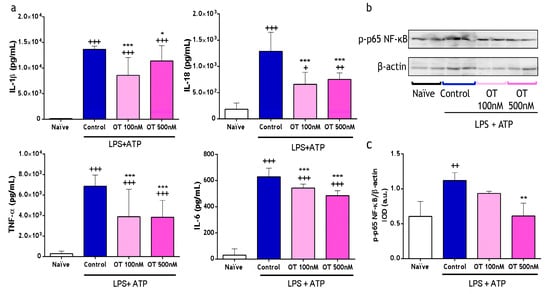 Levels of secreted cytokines and NF-κB activation by peritoneal macrophages stimulated with lipopolysaccharide (LPS) and adenosine triphosphate (ATP). (a) Cytokine levels in cell supernatants were measured via ELISA (6 independent experiments in duplicate). (b) A representative image of Western blotting analysis of p-p65-NF-κB expression on protein extracts from cell lysates of peritoneal macrophages. β-actin is the loading control. (c) p-p65-NF-κB/β-actin is expressed as arbitrary units (a.u.) of integrated optical density (IOD) (4 independent experiments). Values are presented as mean ± S.D. + p < 0.05, ++ p < 0.01, and +++ p < 0.001 versus naïve group; * p < 0.05, ** p < 0.01, and *** p < 0.001 versus control group. One-way ANOVA with Tukey’s post-test in (a,c) to measure statistical significance. OT: osteostatin; LPS: lipopolysaccharide; ATP: adenosine triphosphate.
